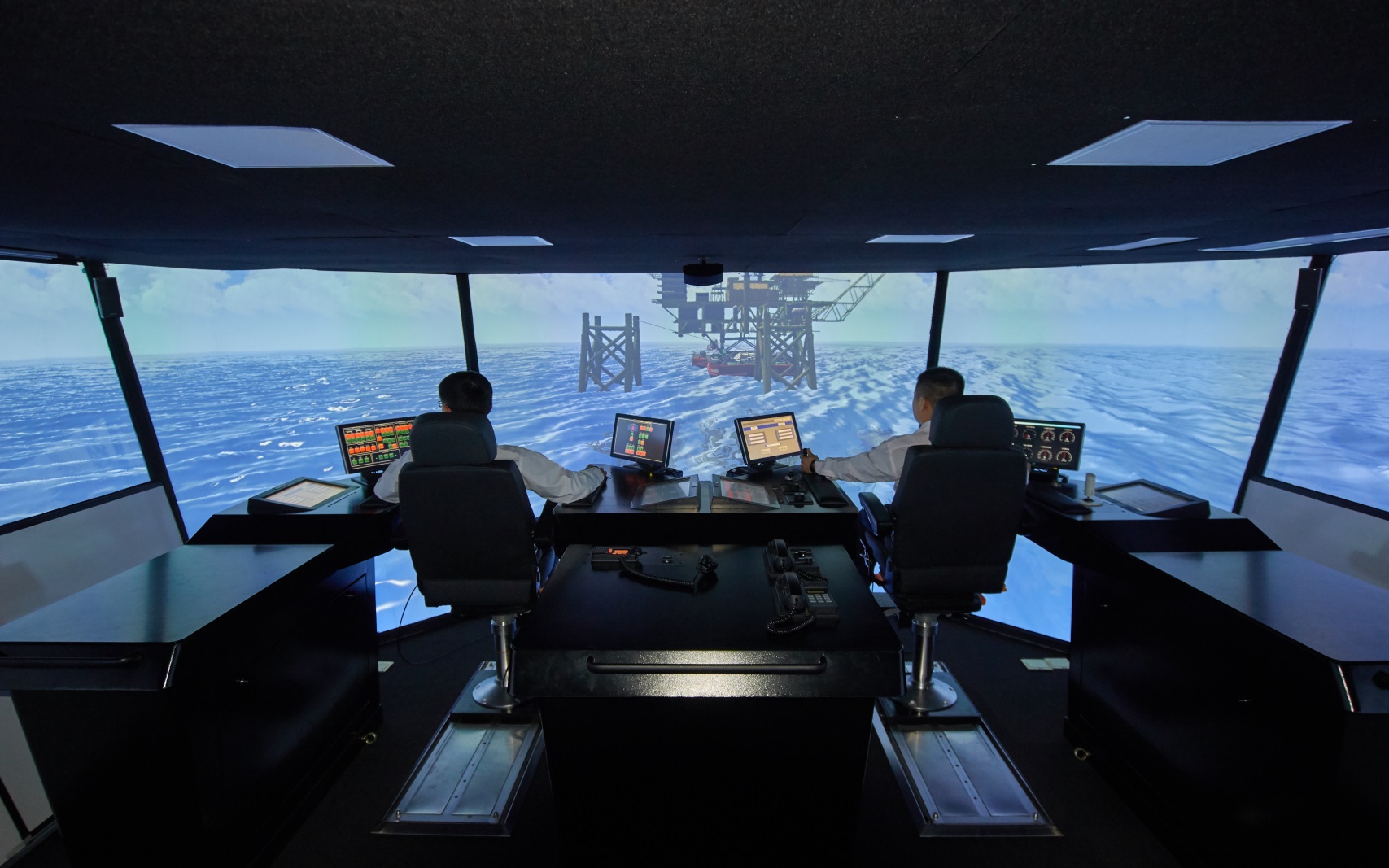 海洋工程作業(yè)仿真裝備包含深水鋪管起重作業(yè)仿真模擬器等專業(yè)模擬器十余套,以及360度環(huán)形投影球幕系統(tǒng)、四面CAVE投影系統(tǒng)等視景顯示裝備,具備海洋工程典型作業(yè)如單吊/雙吊起重、S型/J型鋪管、浮托安裝、錨系處理、水下安裝維修等作業(yè)類型的仿真模擬預(yù)演和人員培訓(xùn)功能,并可開展多裝備多作業(yè)站位協(xié)同仿真。